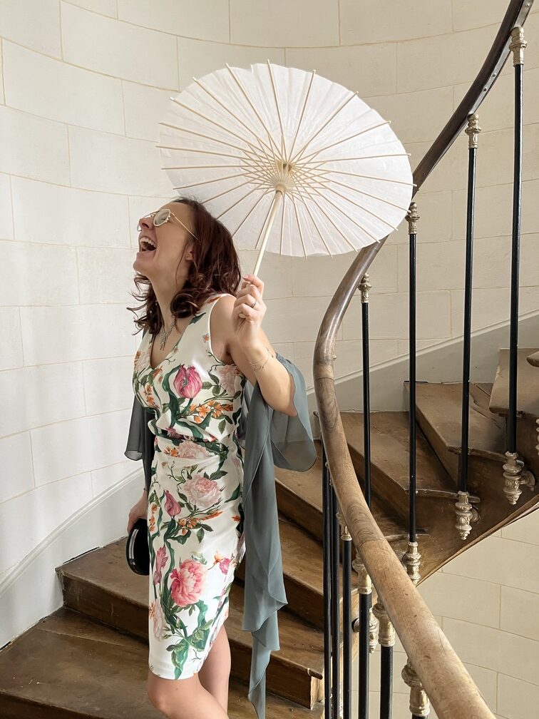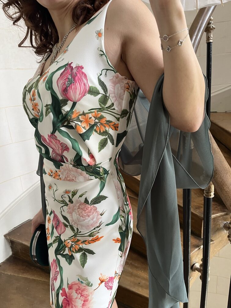 Robe sans manches décolleté en V et son joli drapé ceinture, réalisée dans imprimé fleuri, dynamique qui réveillera toutes vos cérémonies printemps été. Nous lui avons assorti un boléro voile vert, qui saura couvrir vos bras avec élégance et légèreté ! Robe disponible du 40 au 46.