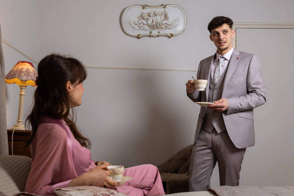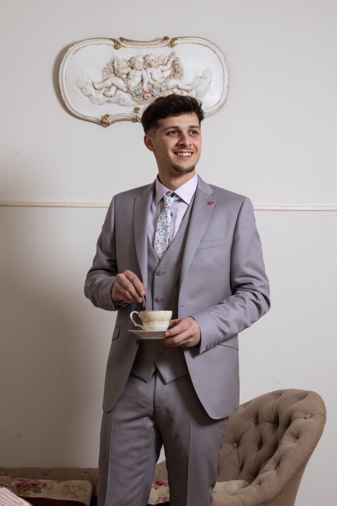 Costume 3 pièces naturel beige rosé avec son gilet sans manches à carreaux , coupe fitée pour un look au tombé parfait!