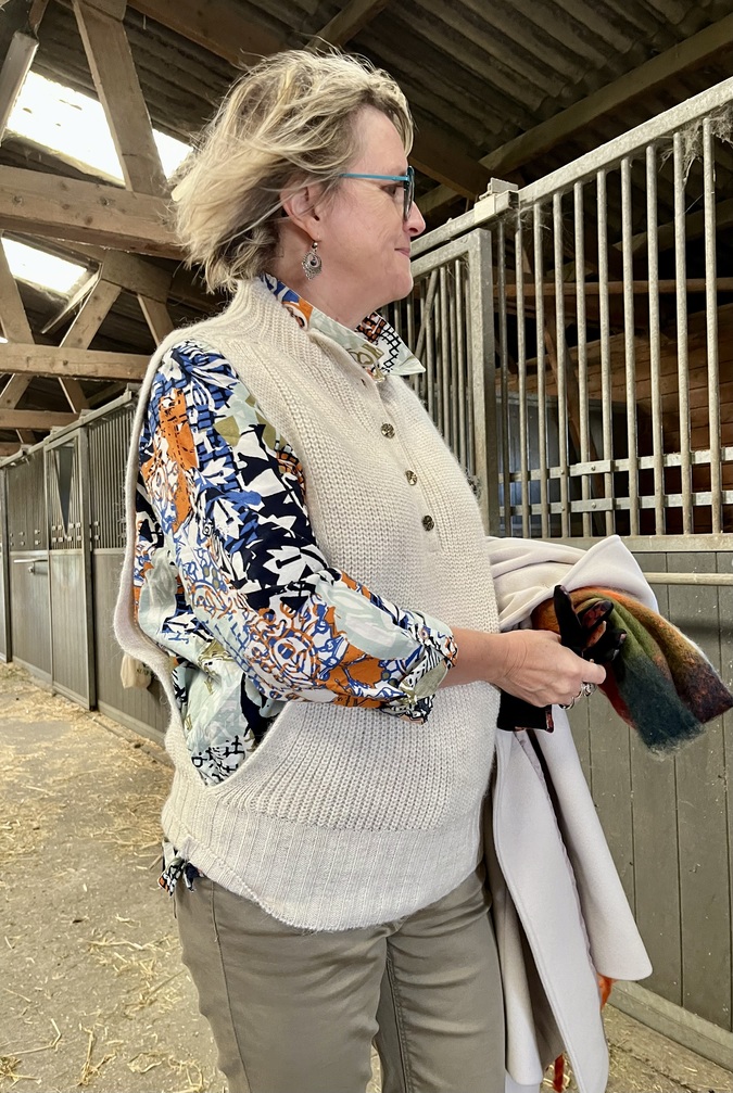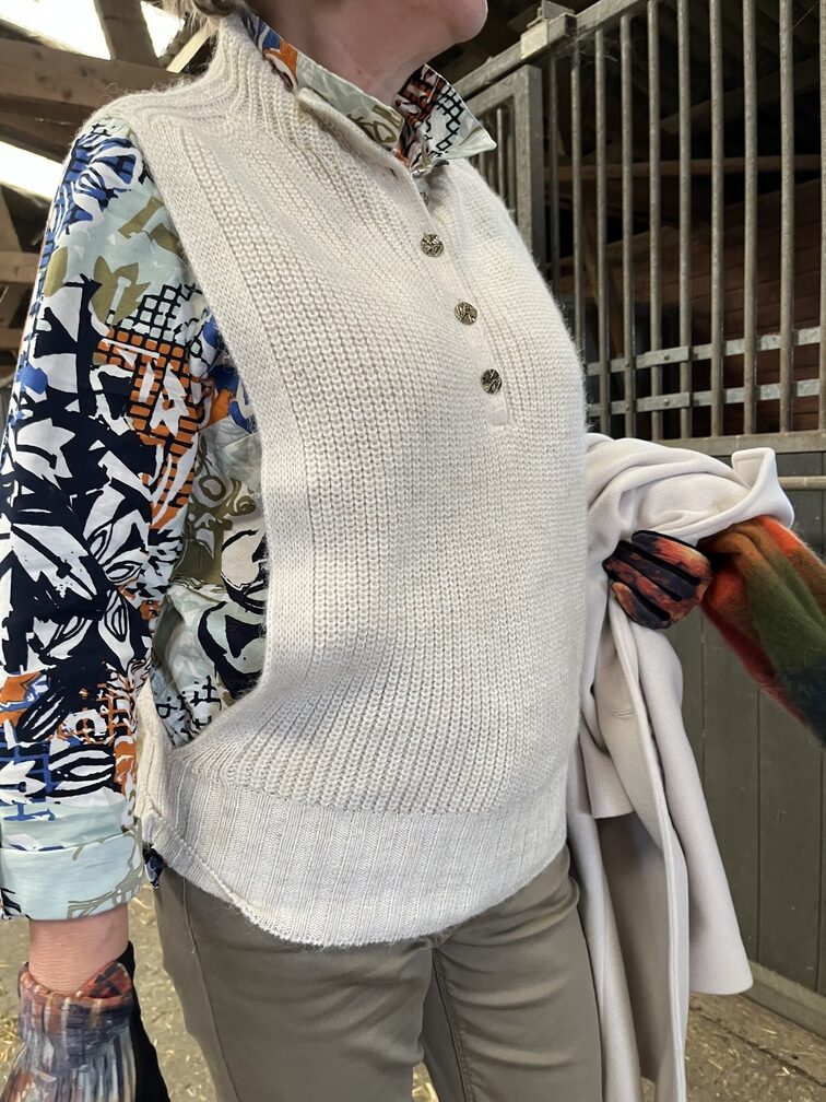 Manteau col tailleur tout doux en laine doublé, couleur craie, chic et facile à assortir ! On y ajoute un joli débardeur à la coupe originale, associé à une tunique White Stuff en coton gratté, que de douceur au programme !
