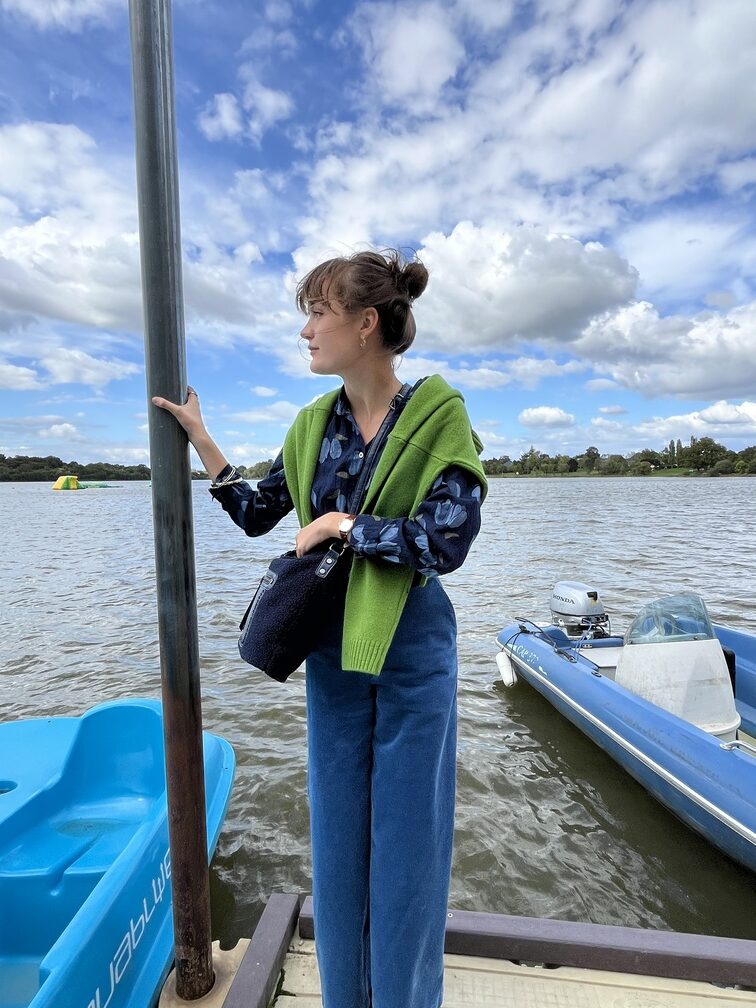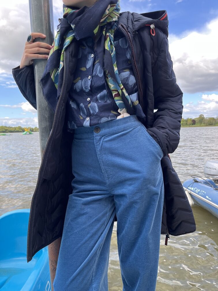 Et bien oui on ose l'association de ces deux jolies couleurs, avec du velours pour un modèle droit et décollé, d'un bleu vieilli associé à un chemisier froissé imprimé tulipes, qui saura se faire adopter à coup sûr, car son entretien est résolument facilité. Un joli pull uni col roulé en 80 laine et une parka capuche 7/8 ème confortable et légère, vous voici parée à toute sortie automnale !