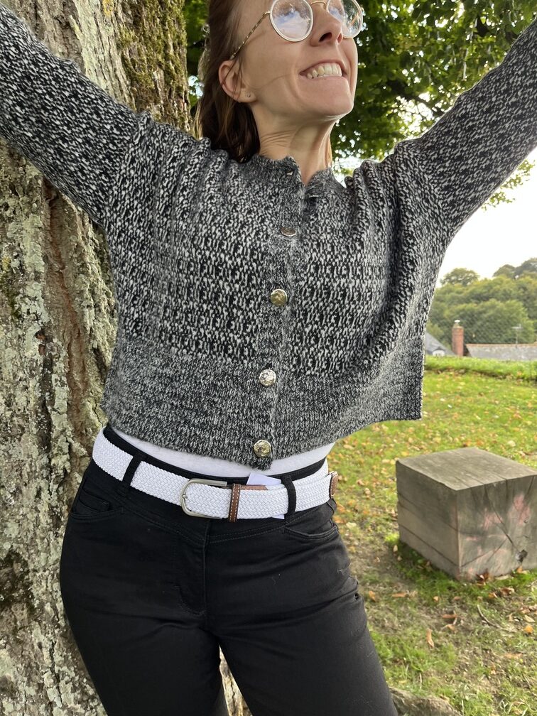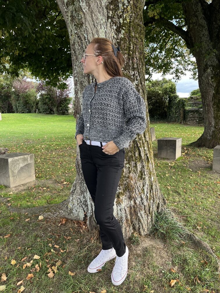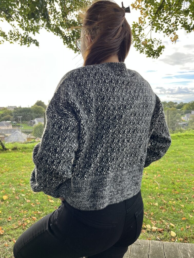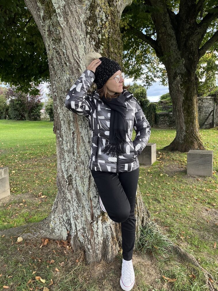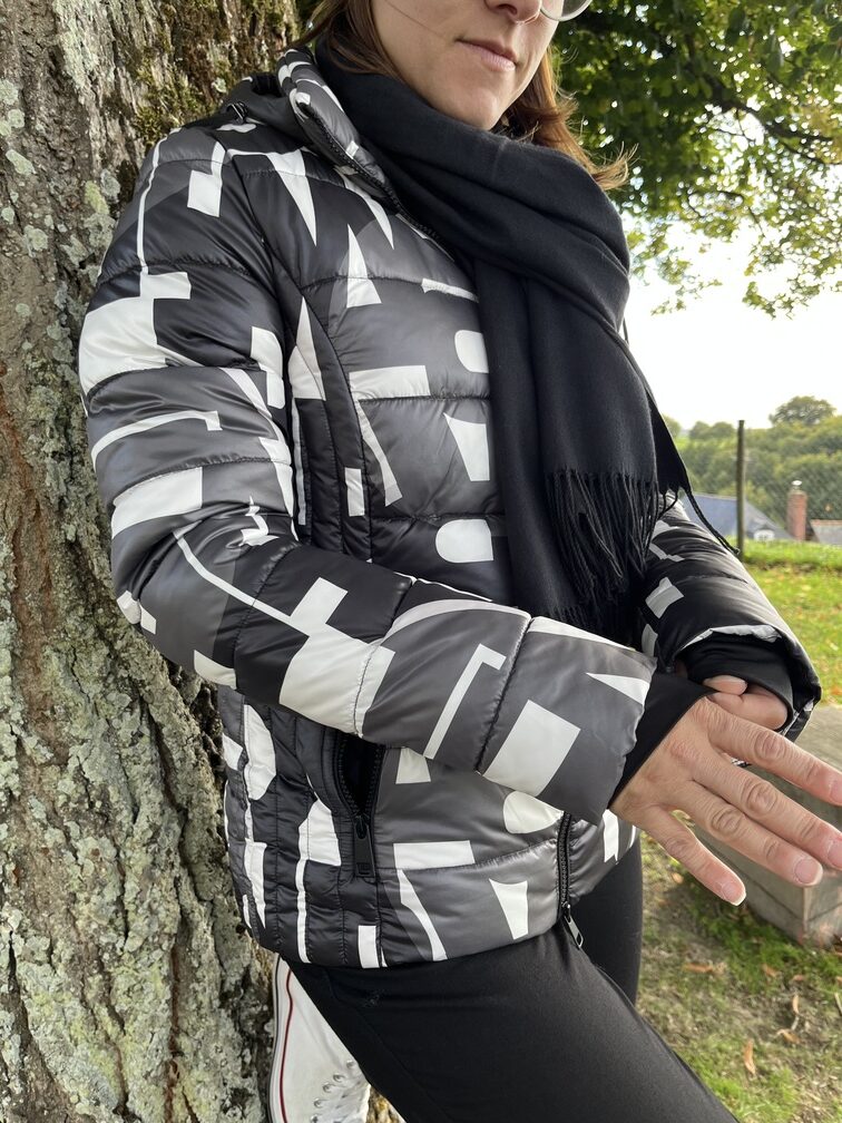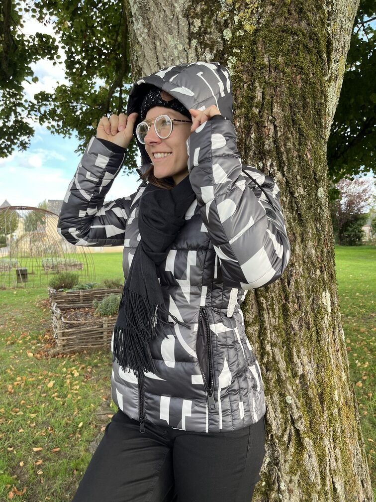 Toute mignonne la parka capuche à l'imprimé géométrique, que l'on marie avec un jeans slim stretch noir, que de confort pour affronter l'hiver ! Un bonnet noir et son écharpe assortie, sans oublier un joli cardigan court, qui met bien en valeur le détail des poches de tout pantalon..