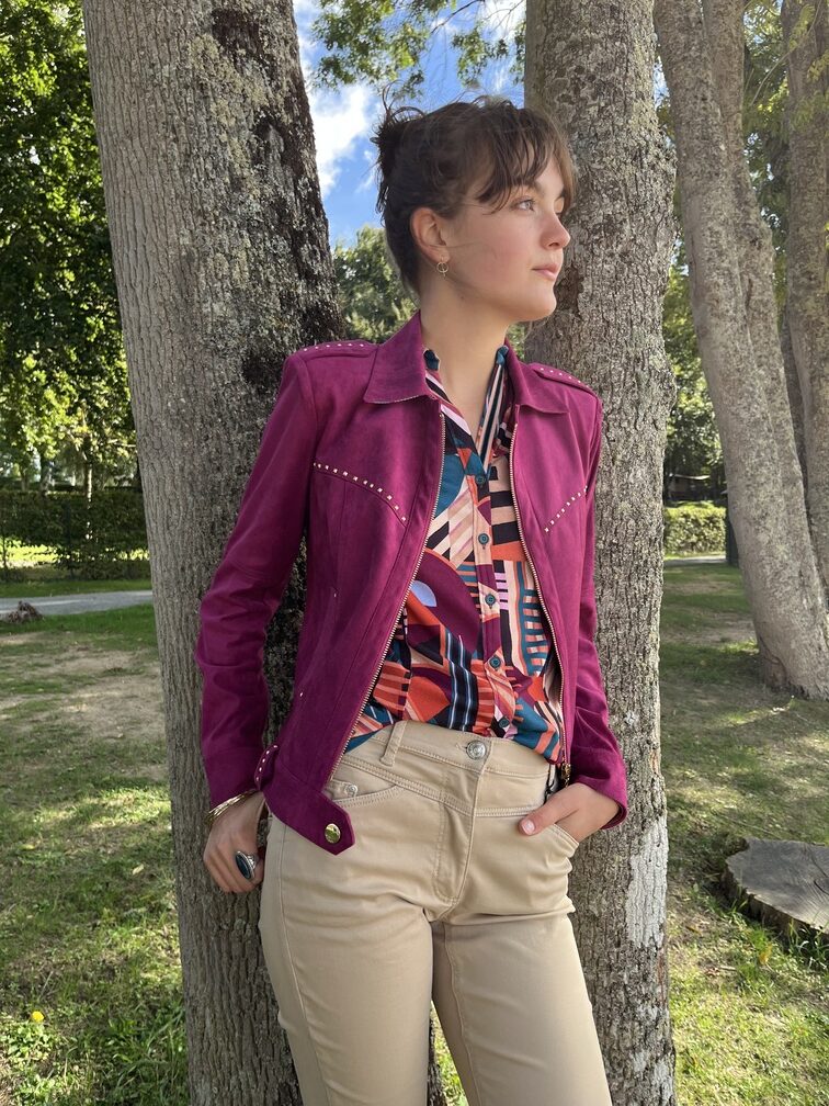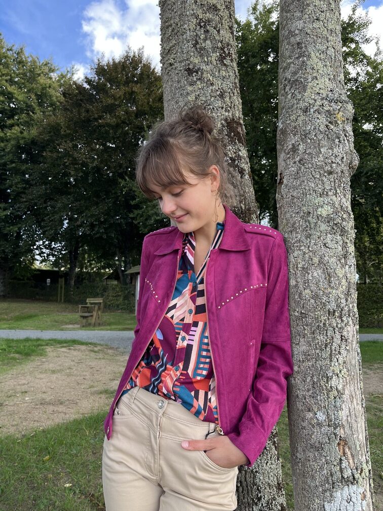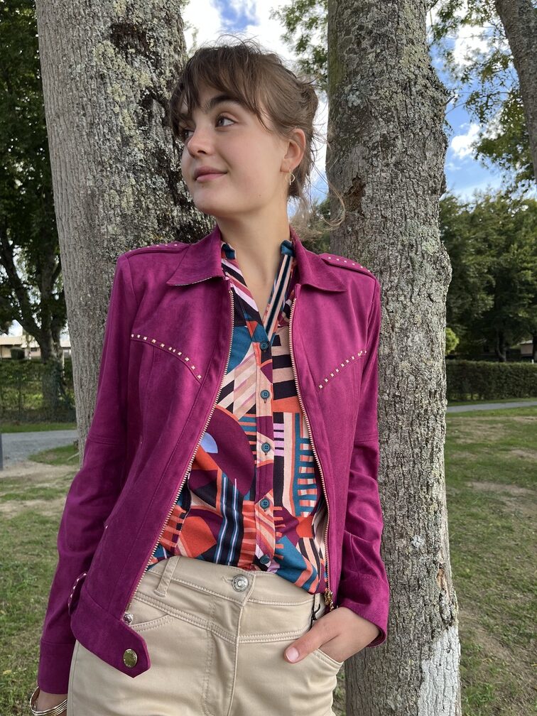Une veste imitation peau couleur fuchsia , sur un chemisier imprimé hyper dynamique, que l'on assorti ici à une toile slim beige, pour un look tendance chic et décontracté à la fois!