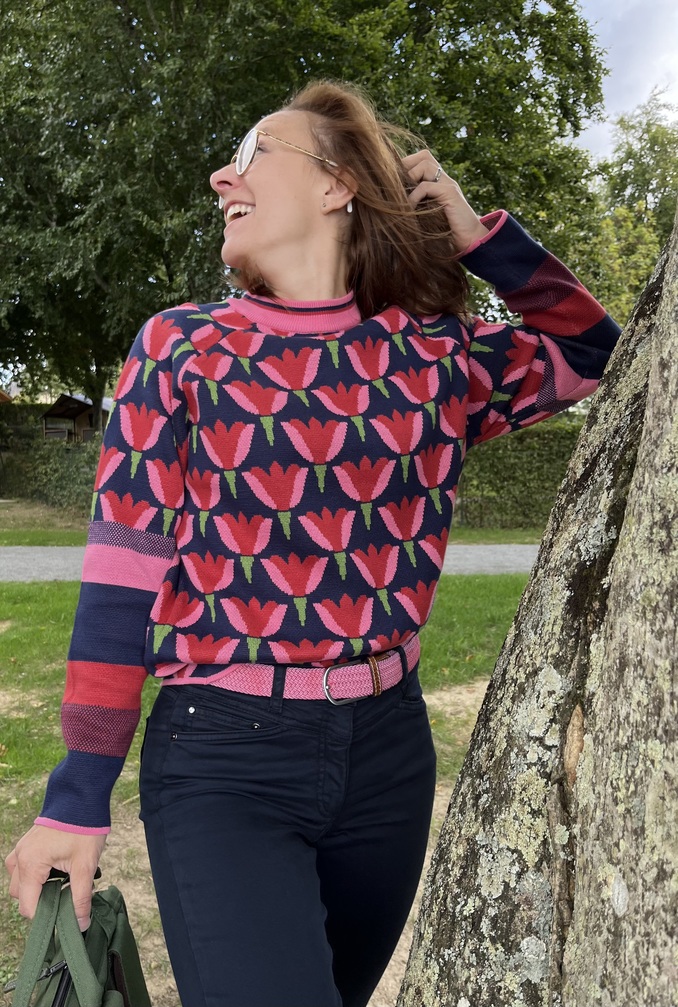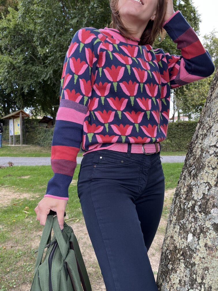 Joli pull à l'imprimé peps pour réveiller toutes vos tenues sportswear de l'automne ! Un pantalon skinny marine et sa ceinture rose coordonnée et la tenue sera complète.