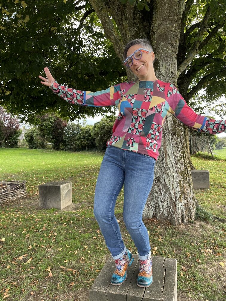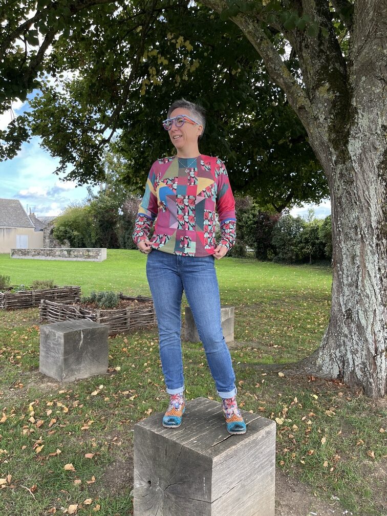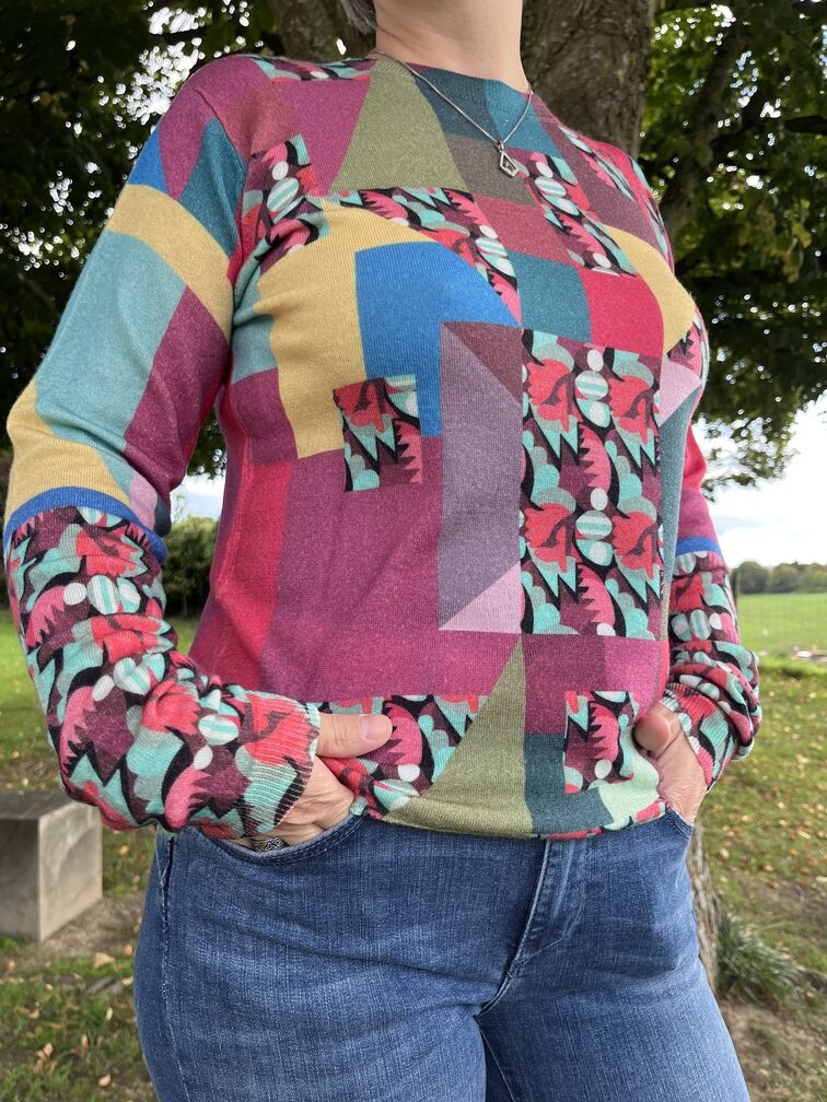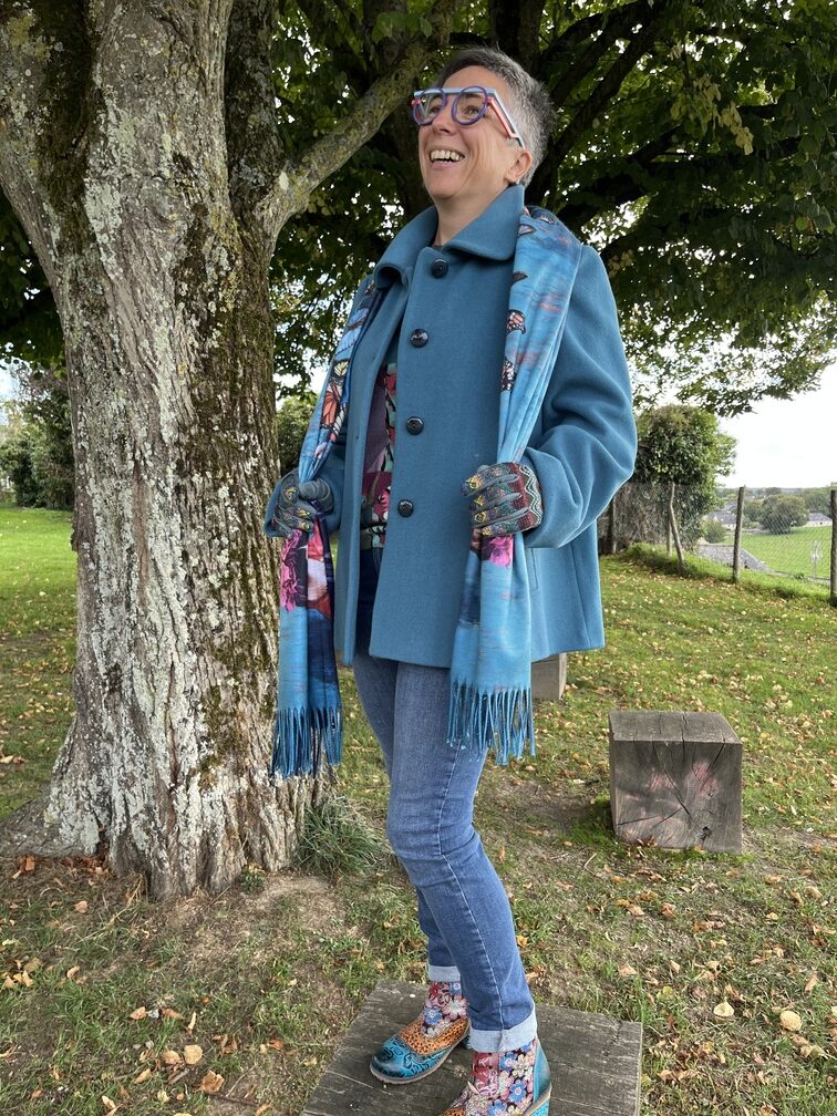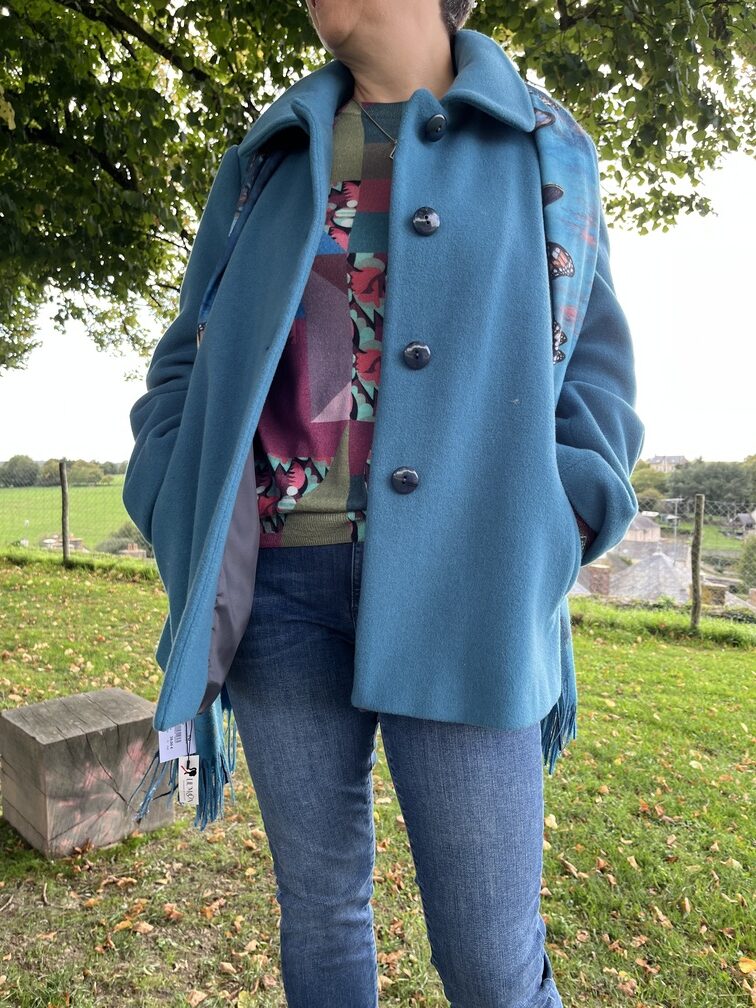 Pull Jeis recto verso en laine 100 % et sa douceur sans pareil sur un jeans slim délavé et son manteau bleu azur !