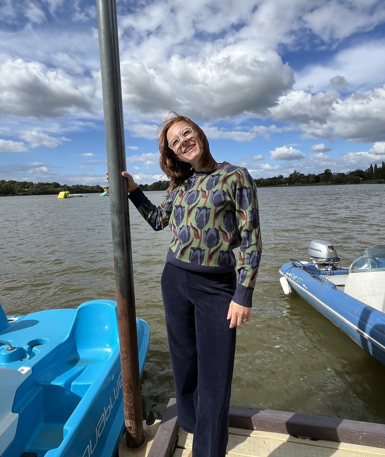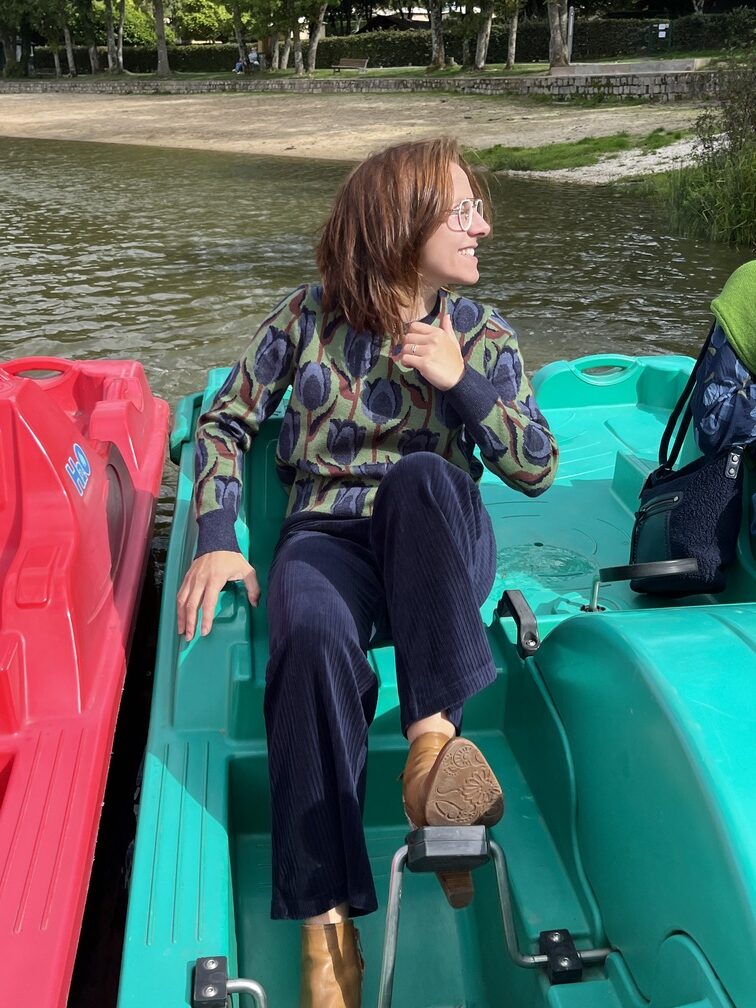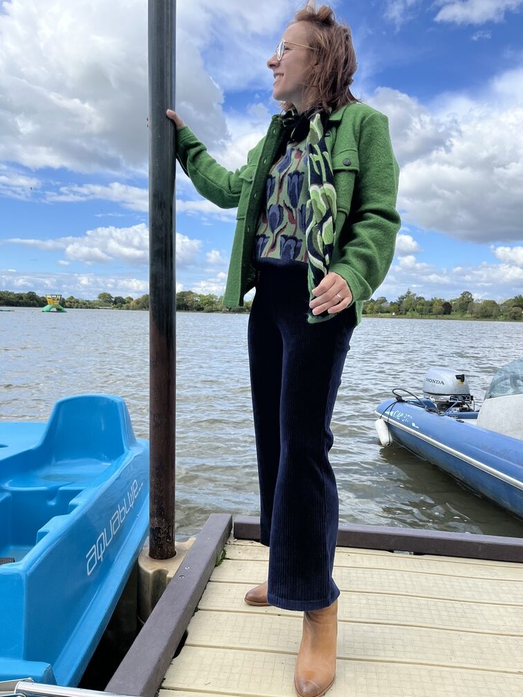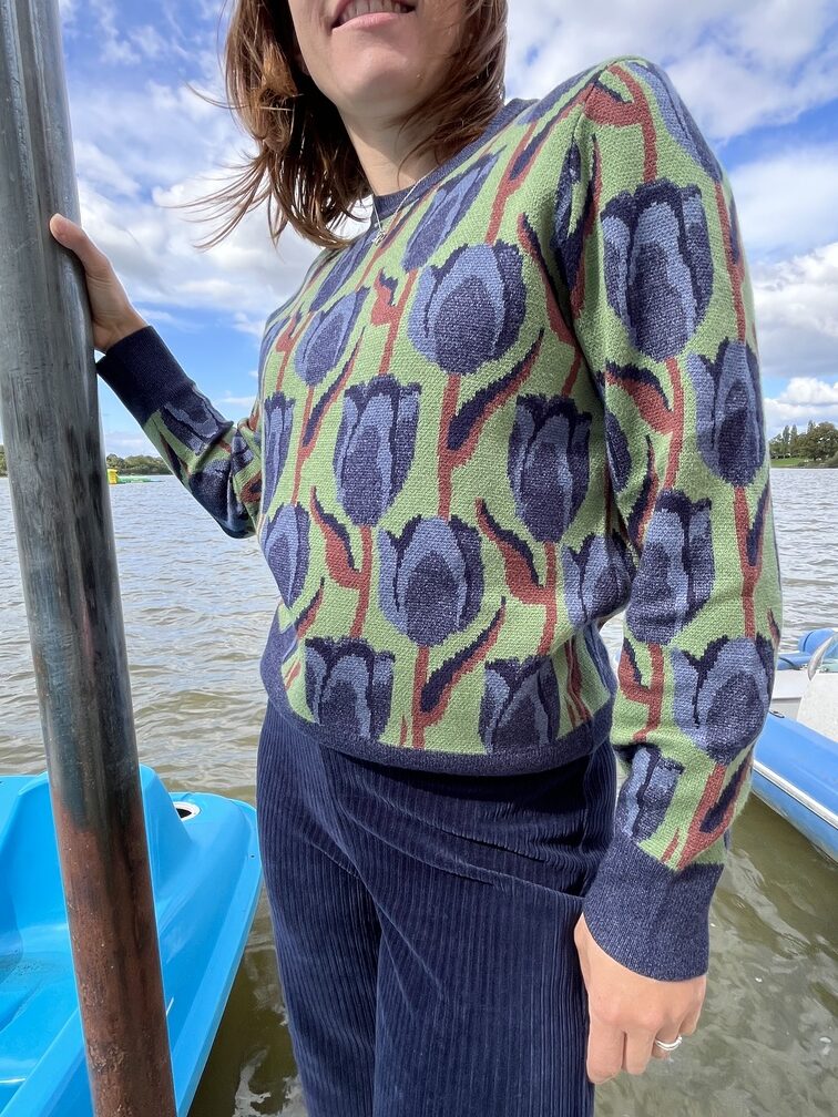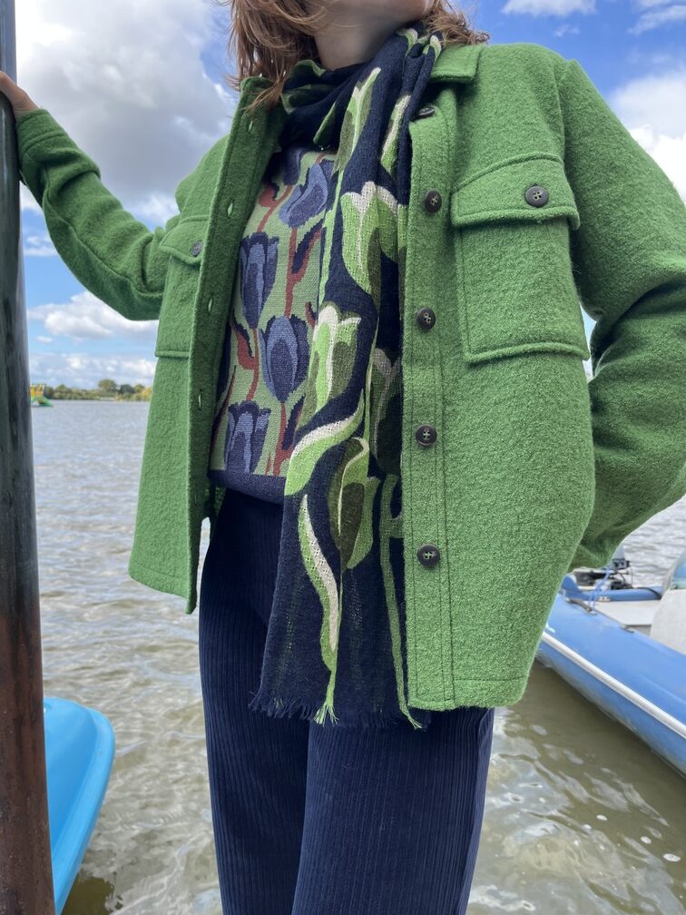 Silhouette rétro chic, le pull à l'imprimé floral, associé à sa veste vert prairie, en laine bouillie, top punchy la tenue. L'hiver sera beaucoup plus facile à supporter avec ces deux couleurs !