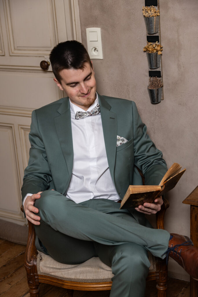Très beau costume vert céladon, pour dynamiser toutes vos cérémonies du printemps été! Du confort et de l'élégance avec une chemise col cassé blanche ou ivoire et son noeud papillon et pochette à l'imprimé fleuri ! Chaussures couleur cognac pour parfaire la tenue, et le tour est joué..